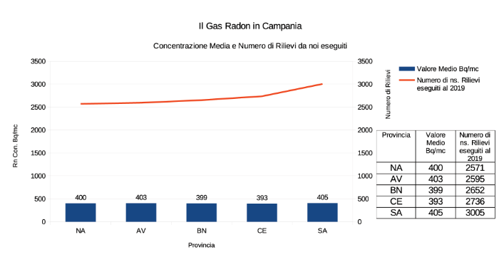Il valore medio italiano del radon indoor è infatti 70 Bq/mc a fronte del valore medio Regionale di circa 400 Bq/mc. Il dato sopra evidenziato si riferisce alle misure eseguite da noi direttamente o da ns. clienti negli ultimi 10 anni; si tratta in totale di 13559 rilievi eseguiti nelle 5 province come risulta più chiaro dal grafico seguente.